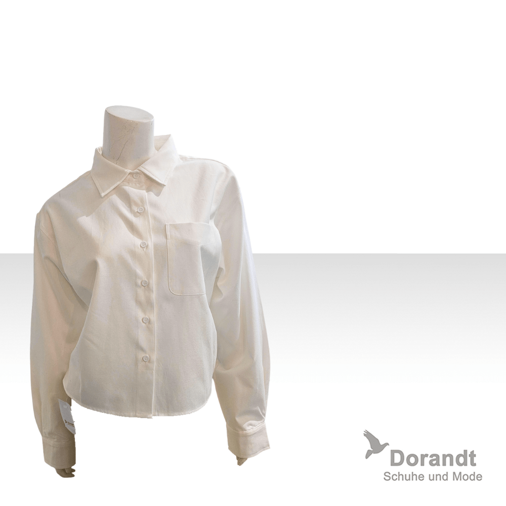 Diese weiße Button‑Up Bluse überzeugt mit einer klaren, modernen Linienführung und einer leicht verkürzten, entspannten Passform. Der klassische Kragen und die durchgehende Knopfleiste verleihen dem Design zeitlose Eleganz, während die einzelne Brusttasche einen dezenten, lässigen Akzent setzt. Die hochwertige Materialstruktur sorgt für ein sauberes, glattes Finish und macht die Bluse zu einem vielseitigen Essential — ideal für Büro, Alltag oder minimalistische Styling‑Kombinationen mit Hosen, Röcken oder Strick.