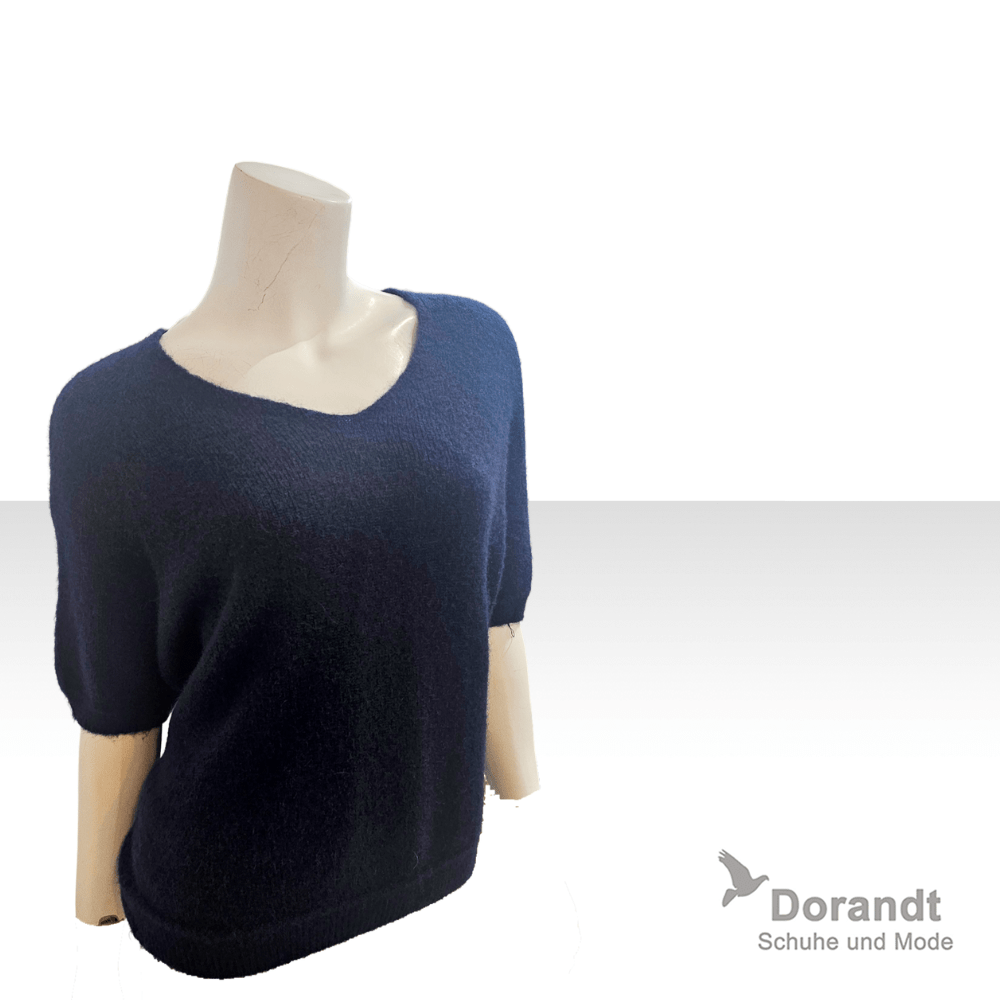Dieser dunkelblaue Kurzarm‑Strickpullover kombiniert eine feminine Silhouette mit einer angenehm weichen Strickstruktur. Der V‑Ausschnitt setzt einen dezenten Akzent und macht das Oberteil ideal für Layering oder solo getragene Looks. Die kurze Ärmelpartie sorgt für Leichtigkeit, während die feine Textur dem Design eine hochwertige, moderne Ausstrahlung verleiht. Perfekt zu Hosen, Röcken oder unter Blazern — ein vielseitiges Essential für jede Saison.