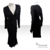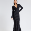 Dieses edle Abendkleid besticht durch seine elegante, bodenlange Silhouette und den tiefen V‑Ausschnitt, der eine feminine Linie betont. Die langen Ärmel und das diagonal strukturierte, leicht schimmernde Material verleihen dem Kleid eine moderne, hochwertige Ausstrahlung.
