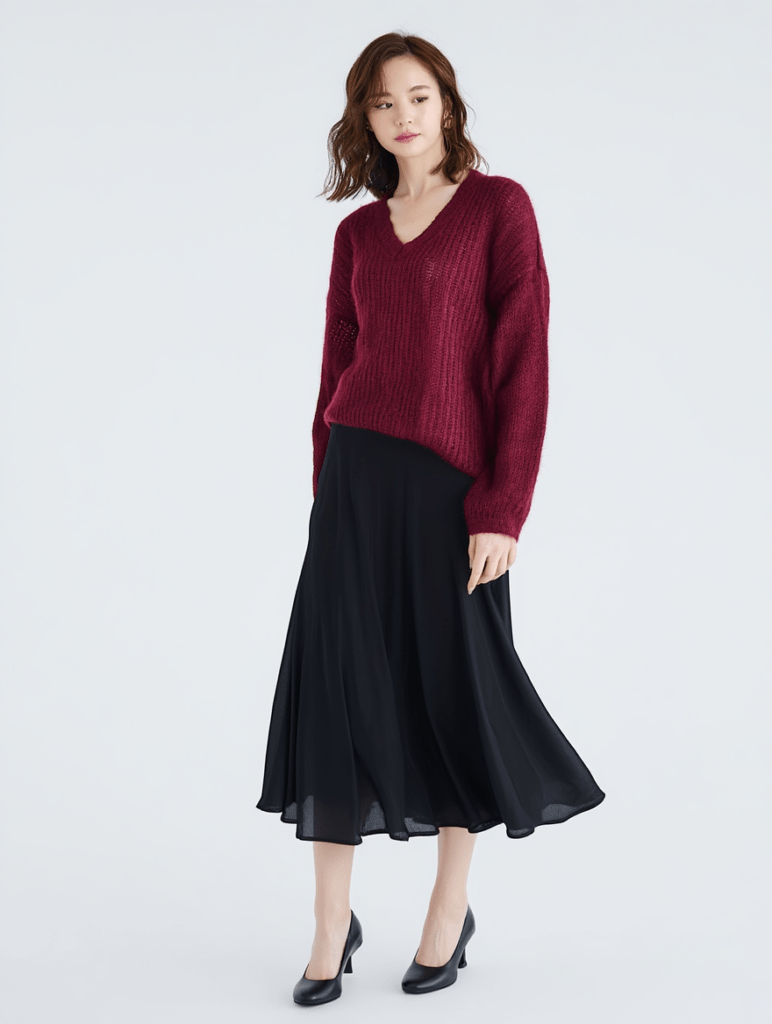 Dieser bordeauxfarbene Strickpullover verbindet eine moderne, entspannte Silhouette mit einem femininen V‑Ausschnitt. Die weiche Strickqualität sorgt für angenehmen Tragekomfort, während der lockere Schnitt eine lässige, dennoch elegante Ausstrahlung verleiht. Die langen Ärmel und die leichte Struktur machen den Pullover zu einem vielseitigen Begleiter für Alltag, Büro oder stilvolle Casual‑Outfits. Ideal kombinierbar mit Röcken, Hosen oder über Kleidern — ein zeitloses Essential für jede Garderobe.