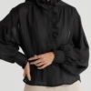 Diese schwarze Rüschenbluse verbindet feminine Eleganz mit einem modernen, leicht dramatischen Look. Die transparente Qualität verleiht dem Design Leichtigkeit, während der gerüschte Stehkragen und die verzierte Knopfleiste einen edlen, verspielten Akzent setzen. Die voluminösen Ärmel mit gerafften Abschlüssen sorgen für eine ausdrucksstarke Silhouette, die jedes Outfit sofort aufwertet. Ob zu eleganten Hosen, Röcken oder als Highlight unter einem Blazer — diese Bluse ist ein stilvolles Statement‑Piece für besondere Anlässe und anspruchsvolle Looks.