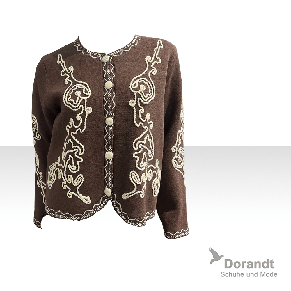 Elegante braune Strickjacke mit kunstvoller weißer Stickerei und dekorativen Knöpfen. Ein stilvolles Statement-Piece, das Tradition mit moderner Eleganz verbindet.