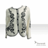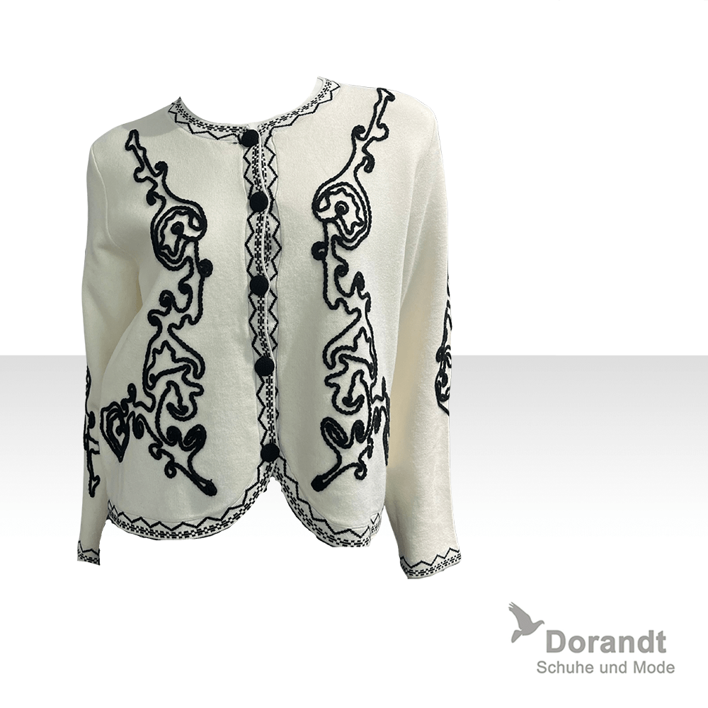 Weiße Strickjacke mit aufwendiger schwarzer Stickerei und Kontrastdetails